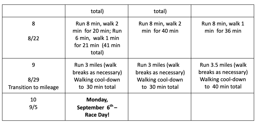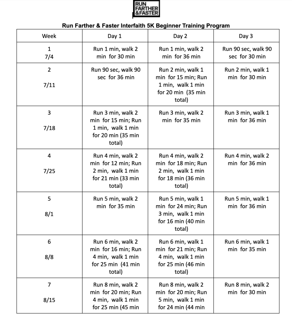 Are you looking for guidance as you prepare for the next Interfaith 5K? We are very fortunate that “Run Farther and Faster” has built us a training plan. You can adjust as needed. This plan is designed for the novice runner.